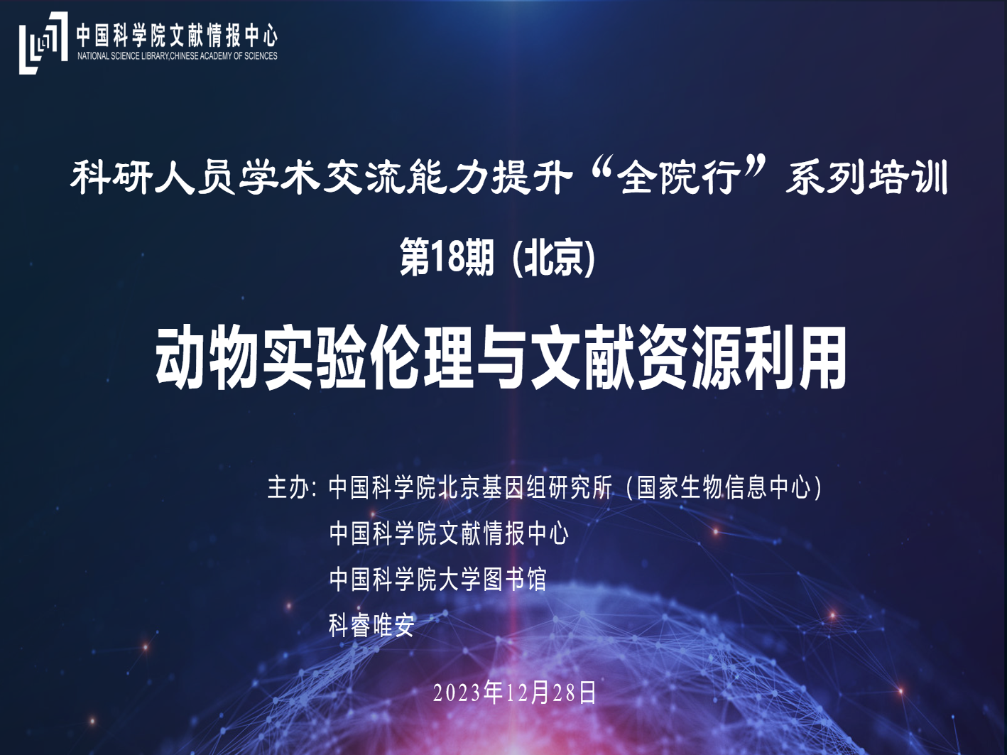 内容简介: 为帮助科研人员深入了解动物实验伦理,熟悉掌握文献数据库使用,助力规范科研和创新,中国科学院文献情报中心联合中国科学院北京基因组研究所(国家生物信息中心)、中国科学院大学图书馆、科睿唯安共同举办讲座活动。本次活动是第18期科研人员学术交流能力提升“全院行”系列培训,欢迎积极报名参与! 第18期(北京) 主题:实验动物伦理与文献资源利用 主办:中国科学院北京基因组研究所(国家生物信息中心) 中国科学院文献情报中心 中国科学院大学图书馆 科睿唯安 时间:2023年12月28日9:30-12:00 活动地点:中国科学院北京基因组研究所(国家生物信息中心)一层会议室 培训内容 主持人:张治华 研究员 中国科学院北京基因组研究所(国家生物信息中心) 报告题目 大纲 主讲人 报告1:认识实验动物 1. 介绍实验动物贡献; 2. 了解实验动物管理; 3. 解读实验动物福利和动物实验伦理 4. 互动与交流 孙强 研究员 中国科学院脑科学与智能技术卓越创新中心/神经科学研究所 报告2:超越正式发表版本(Version of Record)——Web of Science助您加速科研创新进程 1. Web of Science与开放科学 2. 超越VoR,Web of Science的实践 3. Web of Science助力加速科研创新 4. 互动与交流 王振 解决方案专家 科睿唯安学术研究事业部 主讲人: 孙强 中国科学院脑科学与智能技术卓越创新中心/神经科学研究所非人灵长类研究平台主任。荣获2018年谈家桢生命科学创新奖,2020年药明康德生命化学研究奖学者奖,2022年上海市自然科学奖一等奖。一直致力于实验动物管理和模式动物构建及相关技术的研发工作。 王振 科睿唯安学术研究事业部解决方案专家,山东大学图书情报硕士,长期专注于高校科研产出绩效分析,在文献计量、社会网络、图书馆文献资源建设等方面有所研究。曾在北京大学、清华大学、中国科学院等高校及科研院所开展各类科研专题讲座二百余场。 媒体支持: Genomics, Proteomics & Bioinformatics (GPB) 中国科讯 中国科学院科研信息素养讲堂