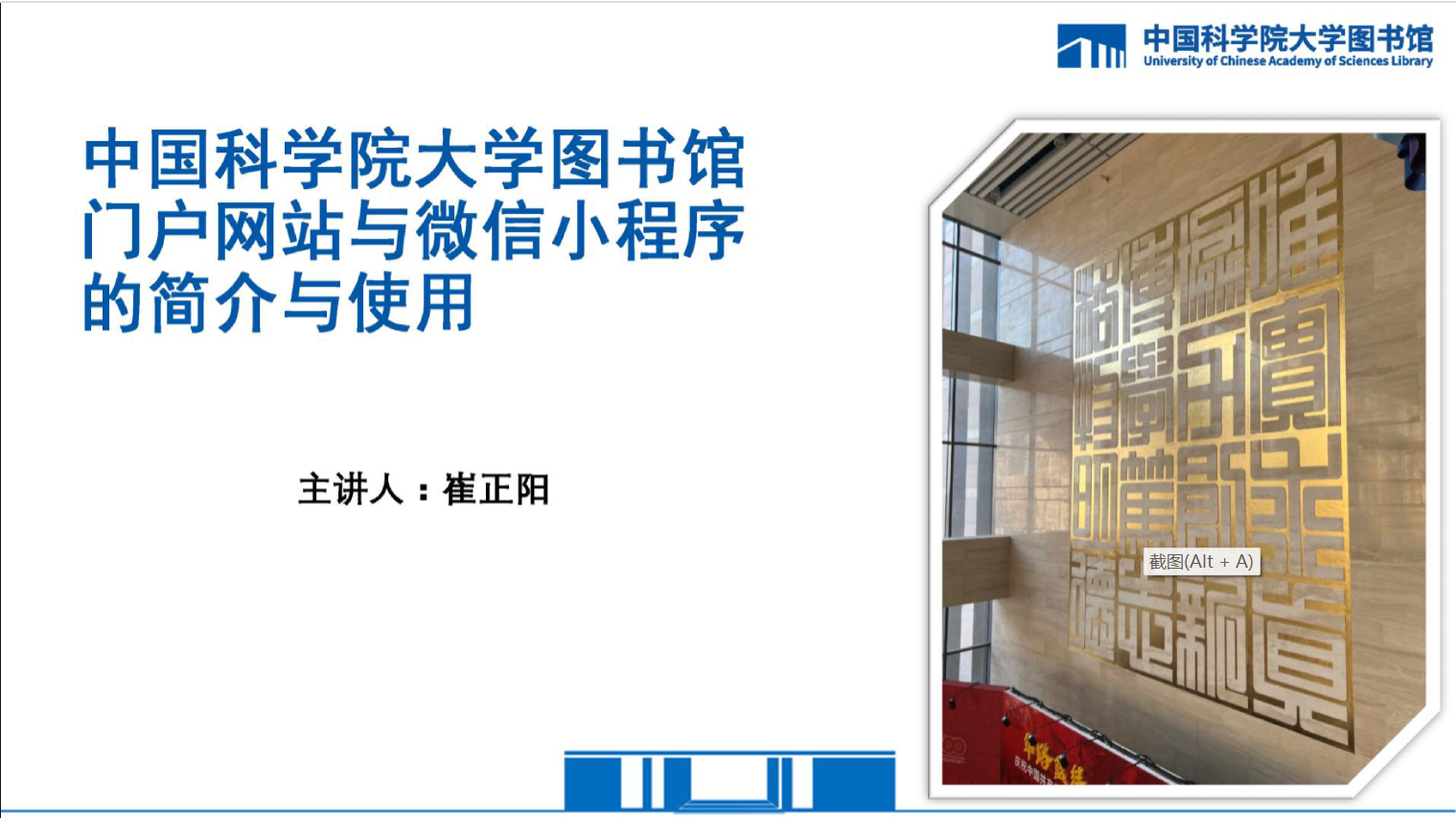 主题:中国科学院大学图书馆网站及微信小程序功能简介 主讲人:崔正阳
