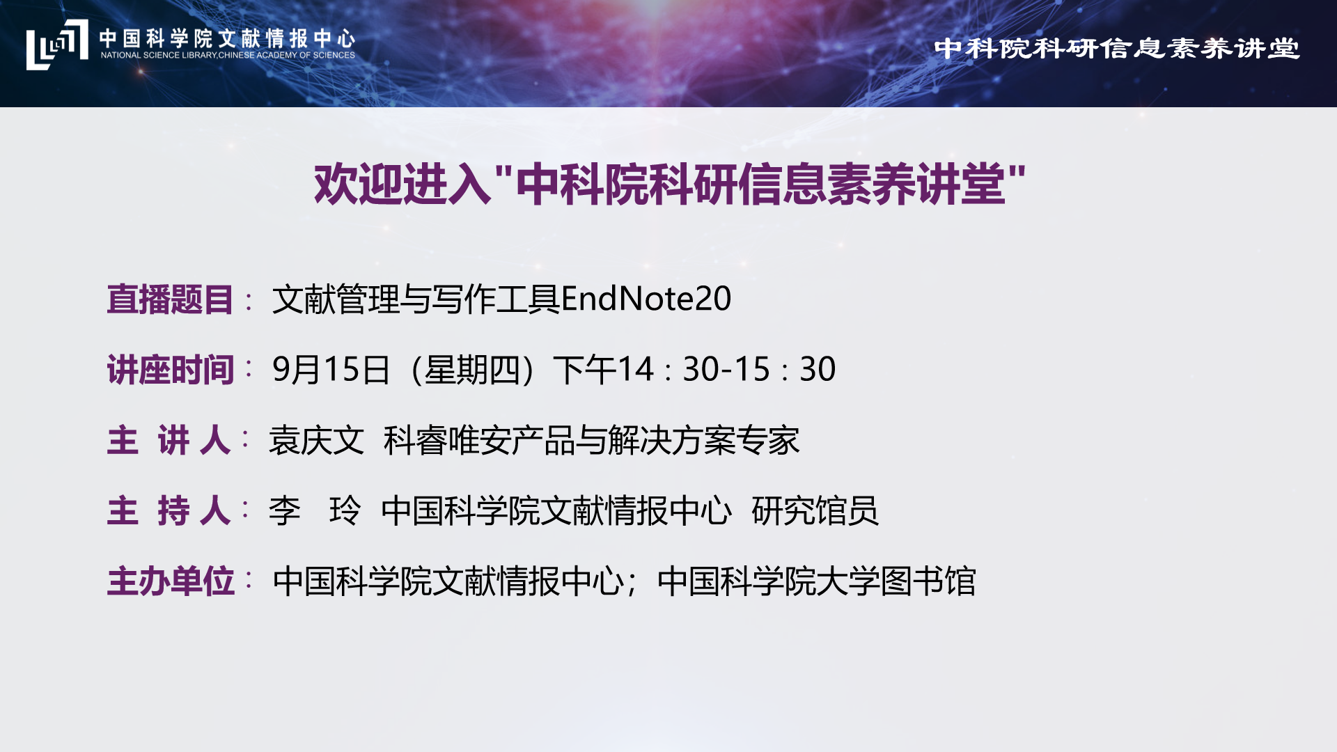 EndNote文献管理软件是数据库使用过程中的重要助手。本场讲座以EndNote20版本为例,介绍文献导入、文献管理和文献引用的基本方法,帮助您实现高效科研协作。欢大家积极参与!